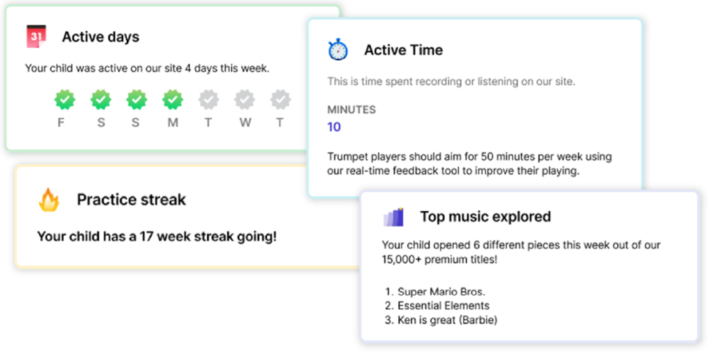 Supporting adults who enroll to receive their child’s Weekly Highlights Email will receive a few helpful messages about encouraging their child musically, tips on how to assist their child with MakeMusic Cloud, and will be reminded of how important their presence is in their child’s musical journey. Additionally, each week they will receive a personalized Highlights Email to give them insights into the music their child is playing, how much they are practicing, what assignments are upcoming, and more!
